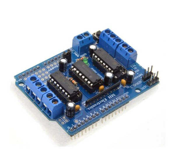 Điều khiển Động cơ Đa năng: Shield có thể điều khiển độc lập tối đa 4 động cơ DC hai chiều (với tốc độ độc lập) hoặc 2 động cơ bước (Stepper Motor). Điều này làm cho Shield trở nên lý tưởng cho các robot 4 bánh hoặc các dự án điều khiển hai trục phức tạp (như cánh tay robot, máy CNC mini).