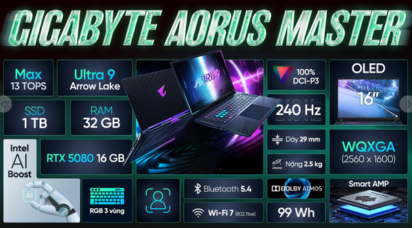 GIGABYTE AORUS MASTER 16 là dòng laptop gaming cao cấp thế hệ mới, kết hợp sức mạnh vượt trội từ Intel Core Ultra 9 275HX, RAM 32GB DDR5, SSD 1TB Gen4 và card đồ họa NVIDIA GeForce RTX 5080 16GB GDDR6X.