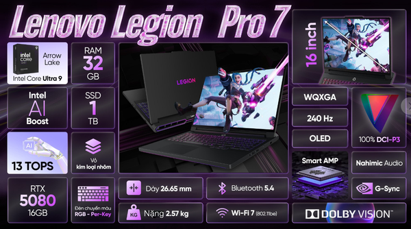 Lenovo Legion Pro 7 16IAX10H là chiếc laptop gaming cao cấp hàng đầu của Lenovo năm 2025, hội tụ sức mạnh vượt trội từ Intel Core Ultra 9 275HX, RAM 32GB DDR5, SSD 1TB PCIe Gen4 và đặc biệt là card đồ họa NVIDIA GeForce RTX 5080 16GB GDDR6X.