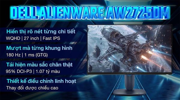 Dell Alienware AW2725DM 27 inch 2K/Fast IPS/180Hz/1ms chính là lựa chọn hoàn hảo cho game thủ cần một màn hình cao cấp với tốc độ, màu sắc chuẩn xác và thiết kế gaming độc đáo.