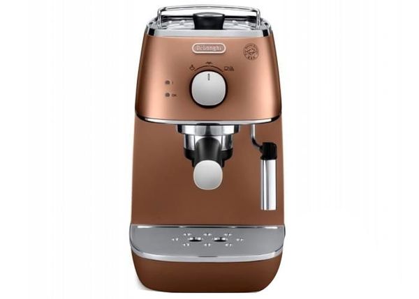 Máy pha cà phê Delonghi Distinta ECI 341.CP được sinh ra từ sự kết hợp hoàn hảo giữa kỹ thuật chế tạo đỉnh cao của Ý và phong cách thiết kế đương đại. Ngay từ ánh nhìn đầu tiên, quý vị sẽ bị cuốn hút bởi lớp vỏ ngoài bằng kim loại mờ (Matt metallic) tinh xảo, phối hợp hài hòa cùng các chi tiết được mạ crom sáng bóng. Màu Đồng (CP - Copper) đặc trưng của mẫu máy này không chỉ mang lại cảm giác ấm áp, cổ điển mà còn toát lên sự sang trọng, quý phái, dễ dàng hòa hợp với bất kỳ không gian bếp hiện đại nào.